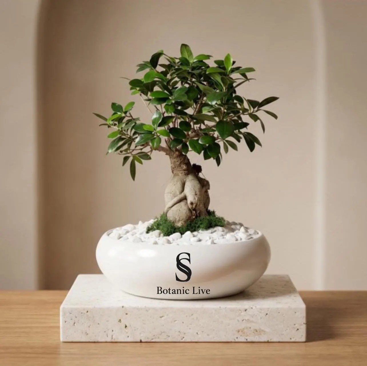A beautiful Ficus Ginseng Bonsai styled in a modern white ceramic bowl with decorative white stones, sand, and moss. Perfect for bright indoor or outdoor in covered area. Easy-care bonsai with a unique sculptural trunk ideal as a statement piece for desks, shelves, and gifting.